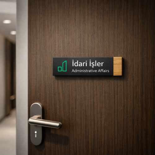 Bu model, özellikle kurumsal ofislerde sıkça kullanılan “İdari İşler” birimi için modern ve şık bir çözüm sunar. Siyah zemin üzerine yerleştirilen beyaz yazı ve yeşil ikon detayı, ürüne çağdaş bir görünüm kazandırırken; yan kısımda kullanılan doğal ahşap blok ise tasarıma sıcaklık ve doğallık katmaktadır. Bu iki farklı malzemenin uyumu, ürünü sıradan kapı tabelalarından ayırarak dikkat çekici hale getirir.